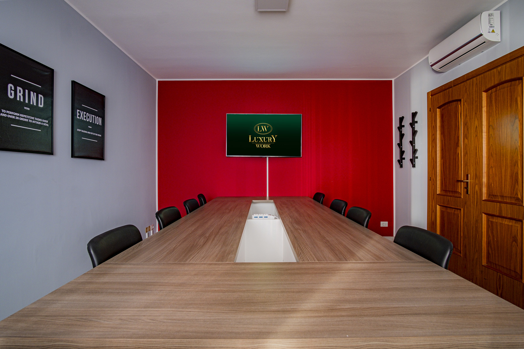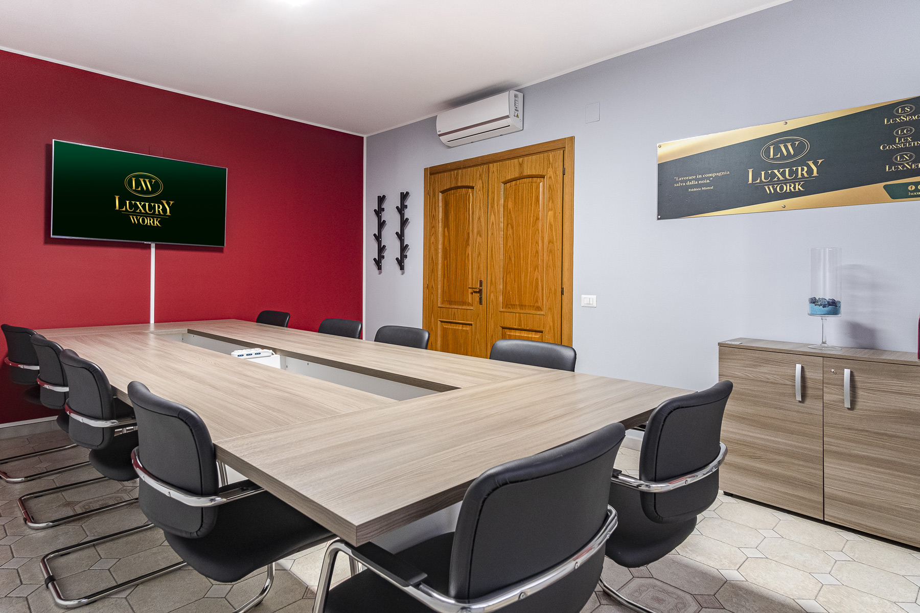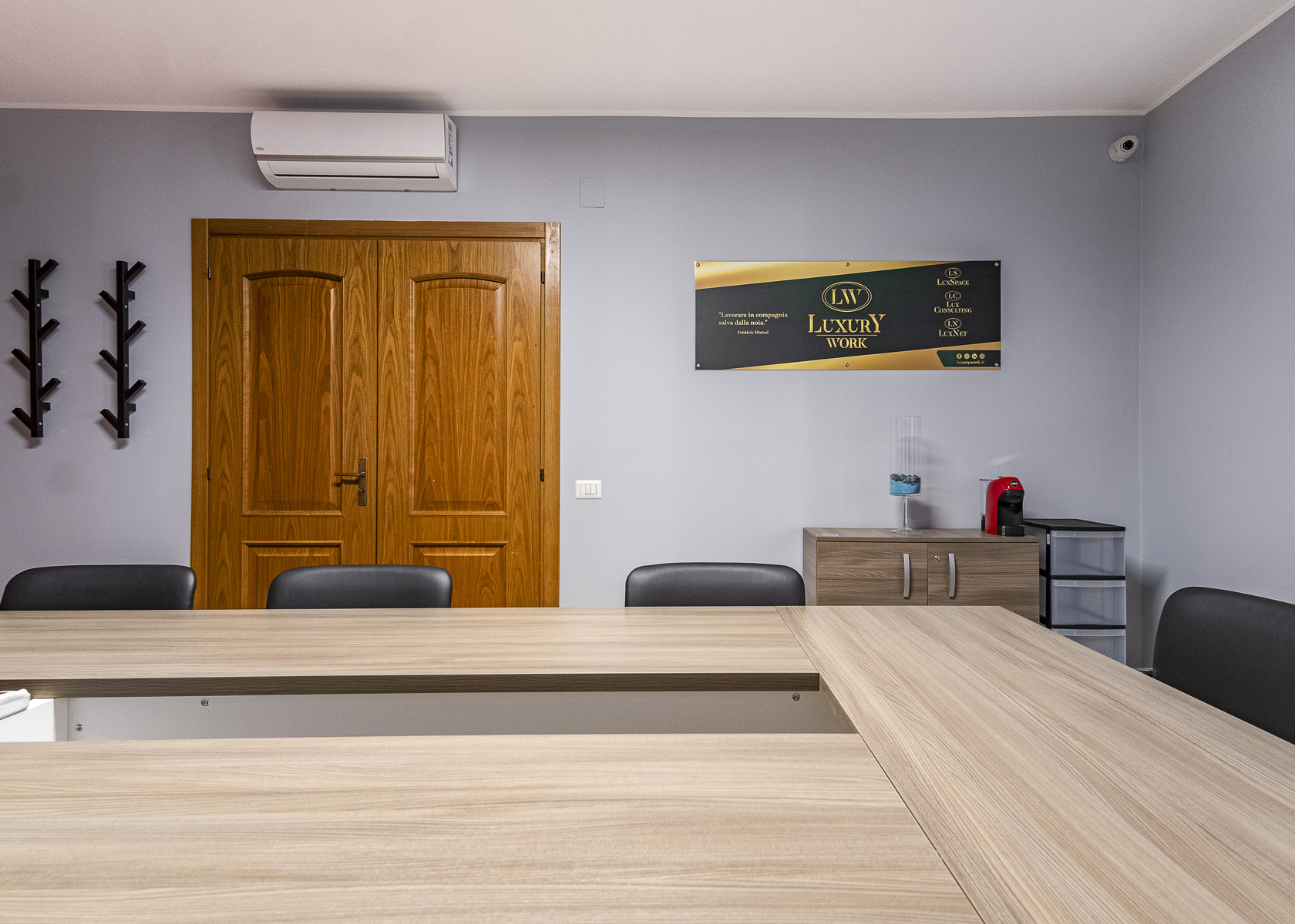 Aula moderna con scrivanie condivise, connessione a internet dispone di spazi per effetti personali e cassettiera per ogni coworker. L’aula è provvista di Smart TV da 55″.