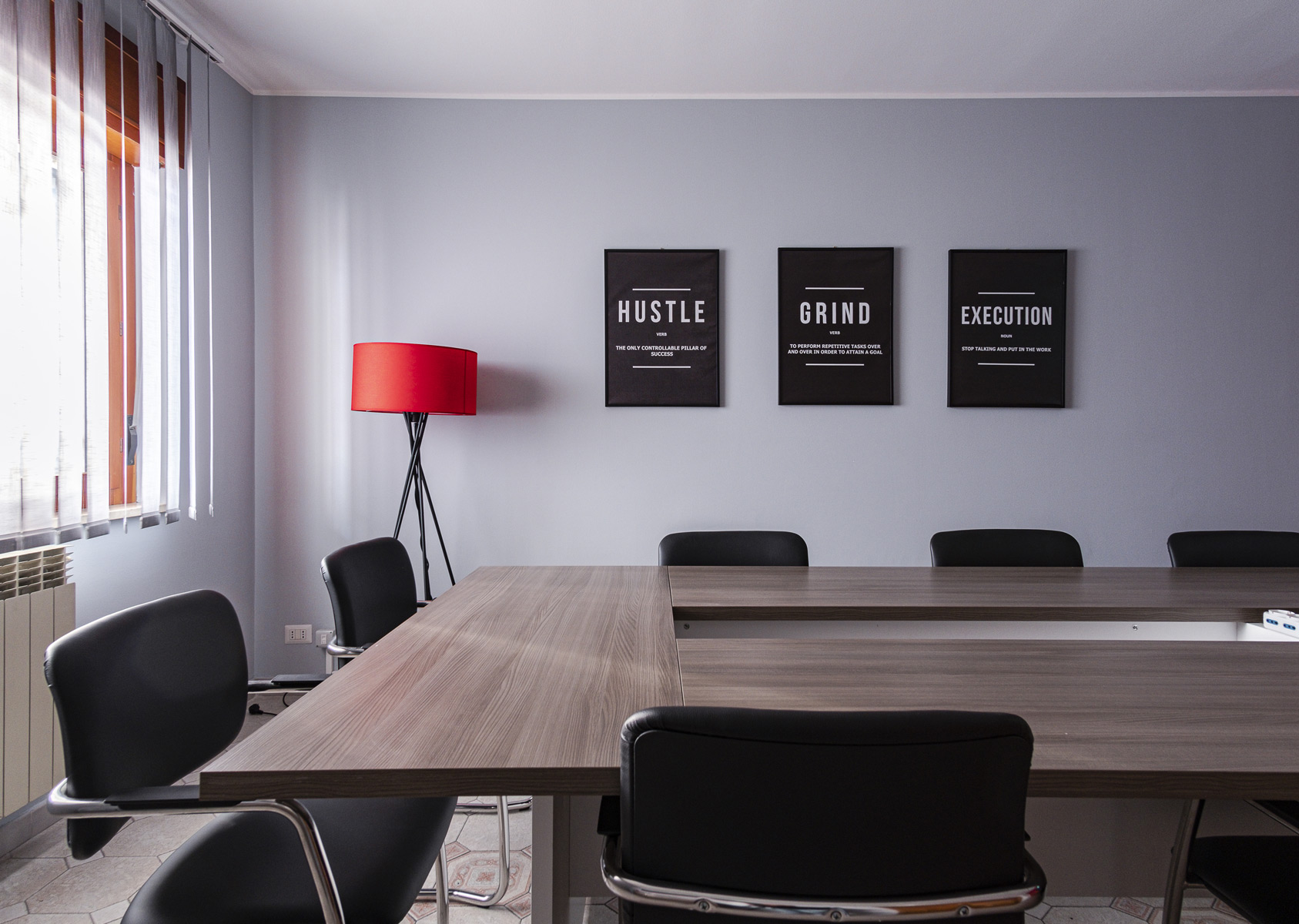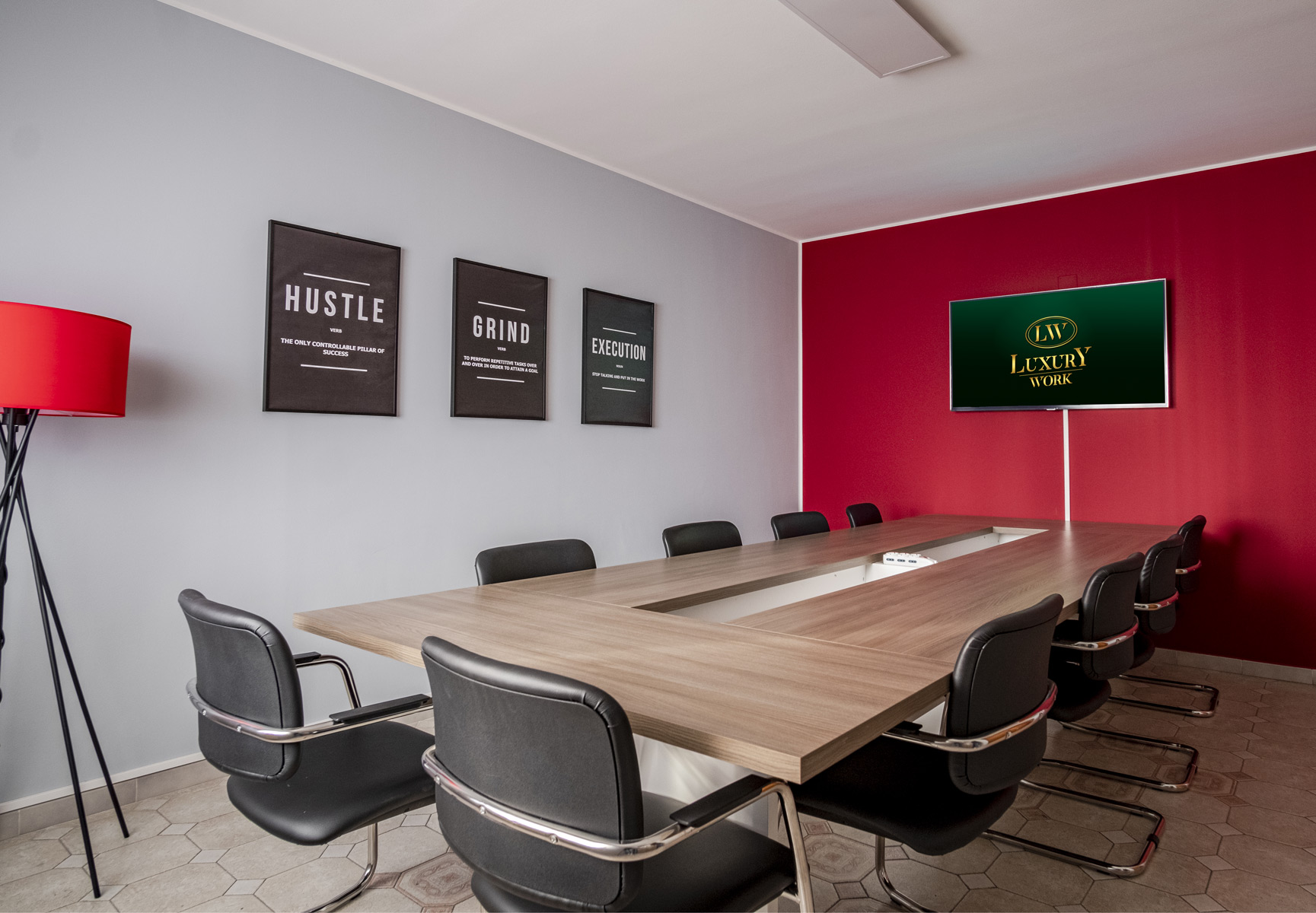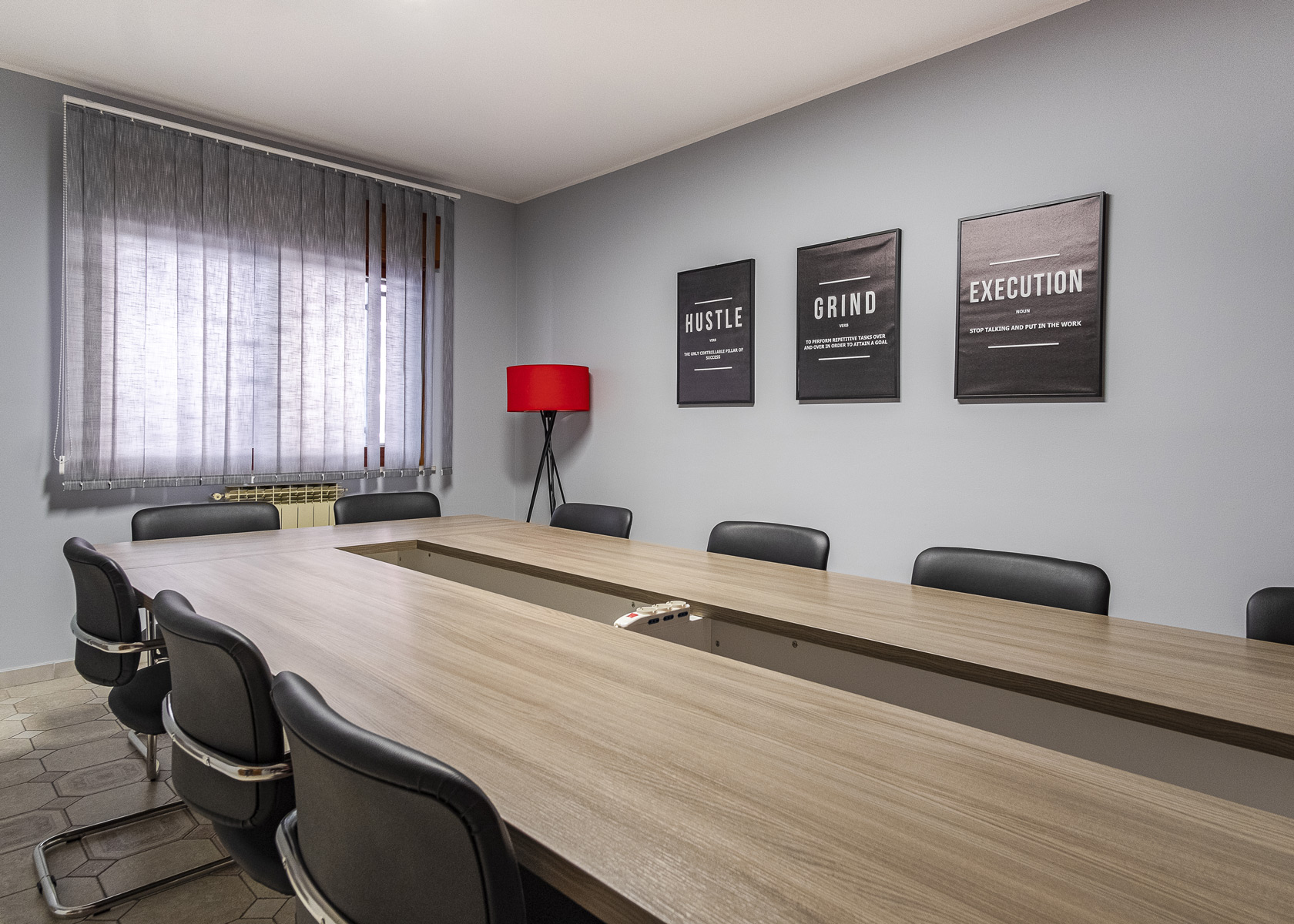 Aula moderna con scrivanie condivise, connessione a internet dispone di spazi per effetti personali e cassettiera per ogni coworker. L’aula è provvista di Smart TV da 55″.